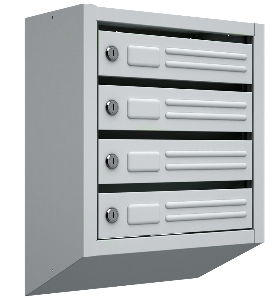 Бюджетный стандартный 4-х секционный почтовый ящик для подъездов серии «Стандарт Бюджет» без задней стенки. Корреспонденция располагается в секции под углом, замки слева, дверца открываются слева на право. Поставляются ящики с комплектом замков.