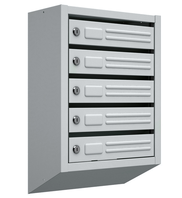 Бюджетный стандартный 5-и секционный почтовый ящик для подъездов серии «Стандарт Бюджет» без задней стенки. Корреспонденция располагается в секции под углом, замки слева, дверца открываются слева на право. Поставляются ящики с комплектом замков.